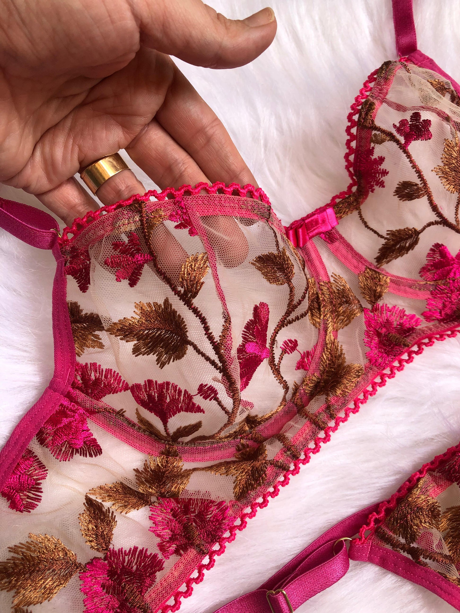 • Tule bordado exclusivo: detalhes florais em pink e dourado que tornam o conjunto delicado e sofisticado.